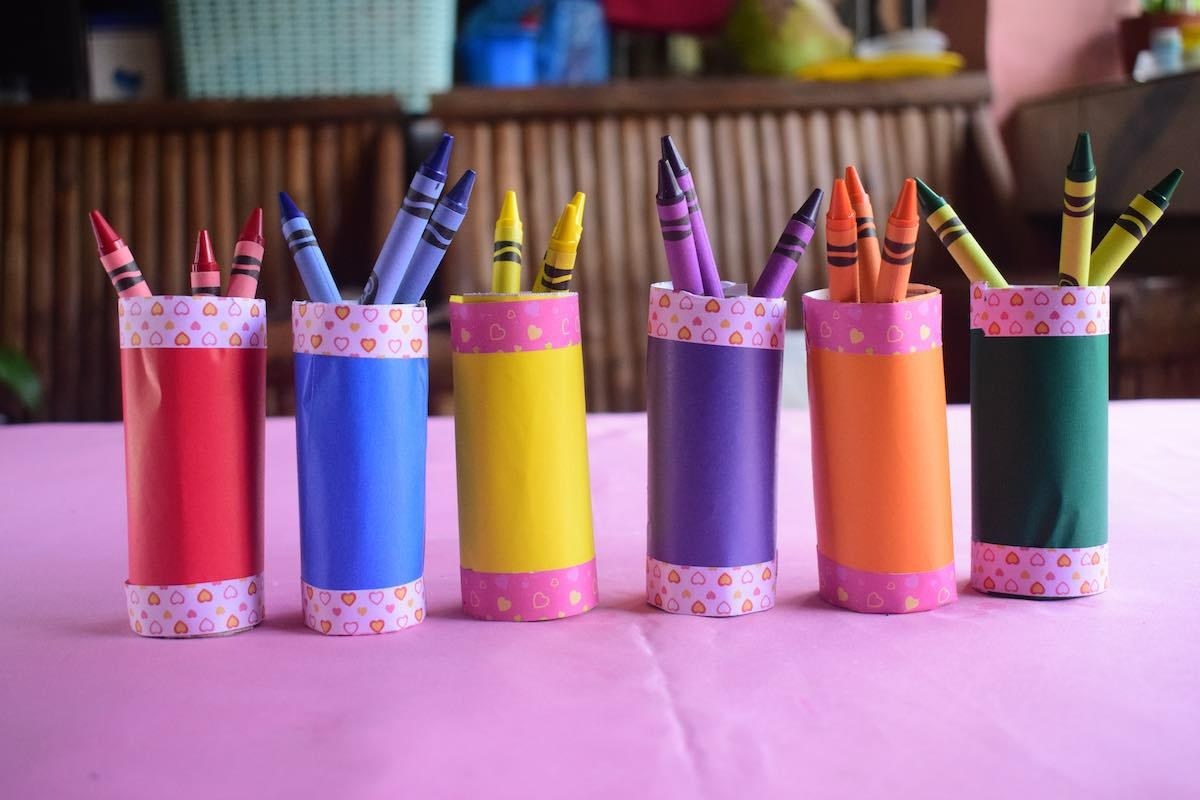 Se hai penne, forbici, pennarelli e righelli sparsi ovunque, questo design è molto professionale e moderno. Per questa idea di riciclo e decorazione dovrai tagliare i tubi in diverse altezze (alcuni più alti, altri più bassi). Incollali tra loro sui lati formando un gruppo compatto. Quindi, incolla l’intero insieme su una base di cartone rigido (come quella di una scatola di cereali).